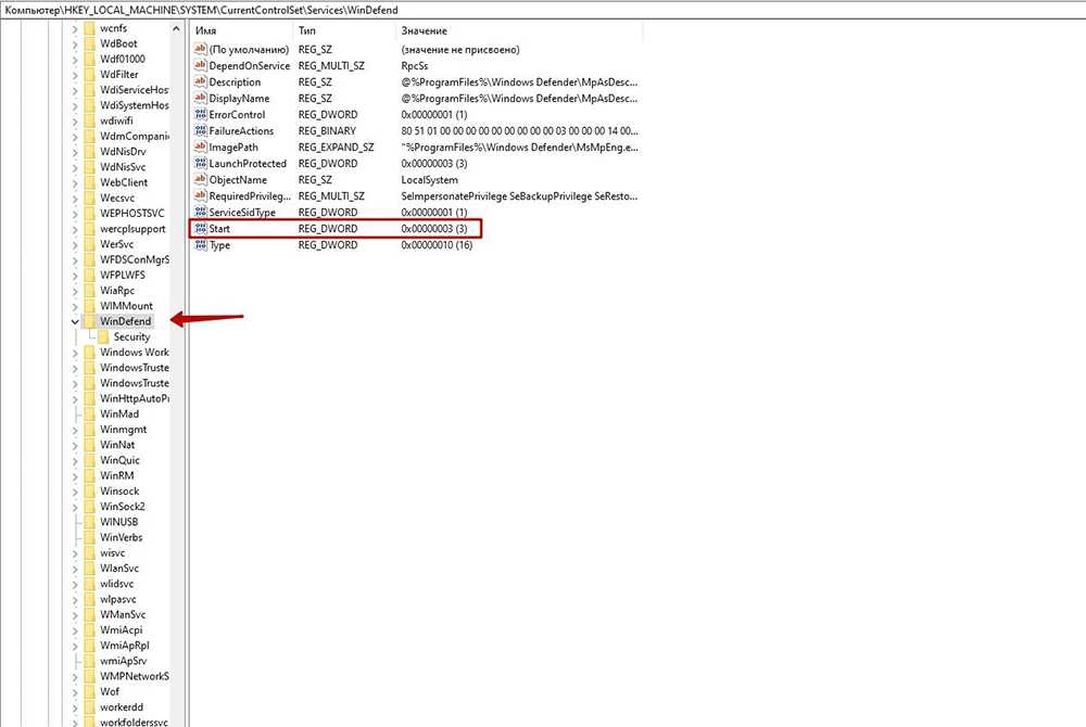 - Перейдите по ветке: HKEY_LOCAL_MACHINE\SYSTEM\CurrentControlSet\Services\WinDefend. На папку WinDefend следует навести курсор и выделить ее.