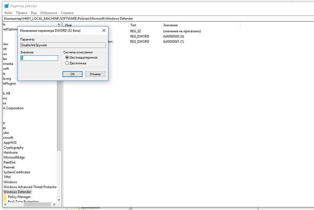 - Справа в окне нажимаем дважды на параметр «DisableAntiSpyware» и вписываем значение «0»;