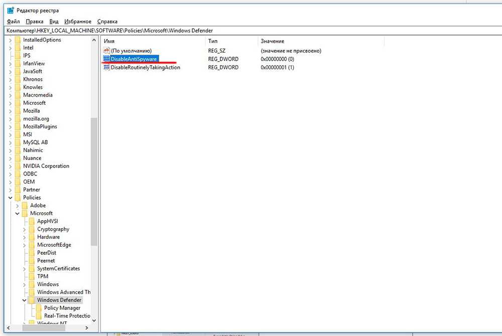 Для активации защиты следует удалить DisableAntiSpyware или вместо цифры 1 в настройках поставить 0.