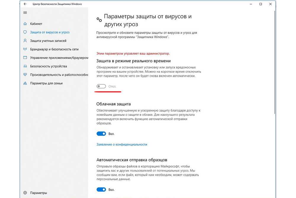 Если вы теперь откроете панель настроек безопасности, то увидите, что защита в режиме реального времени отключена. При этом переключатель защиты окажется недоступным.