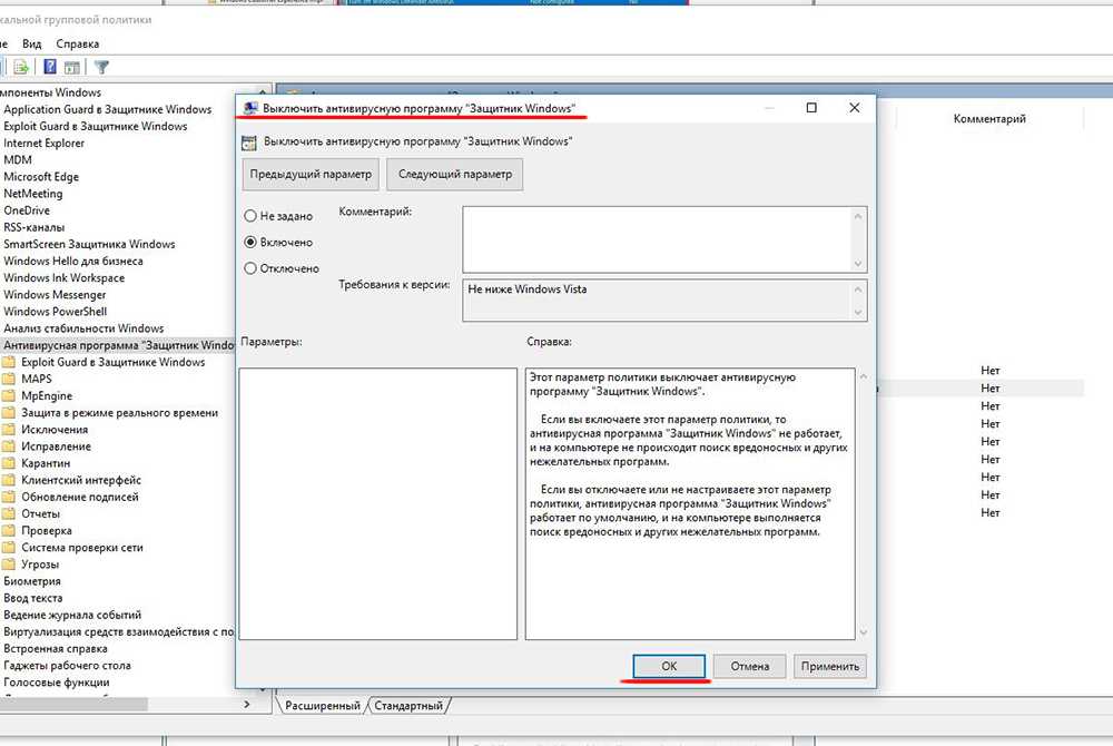 - Закрываем редактор и перезагружаемся, защитник будет включен.