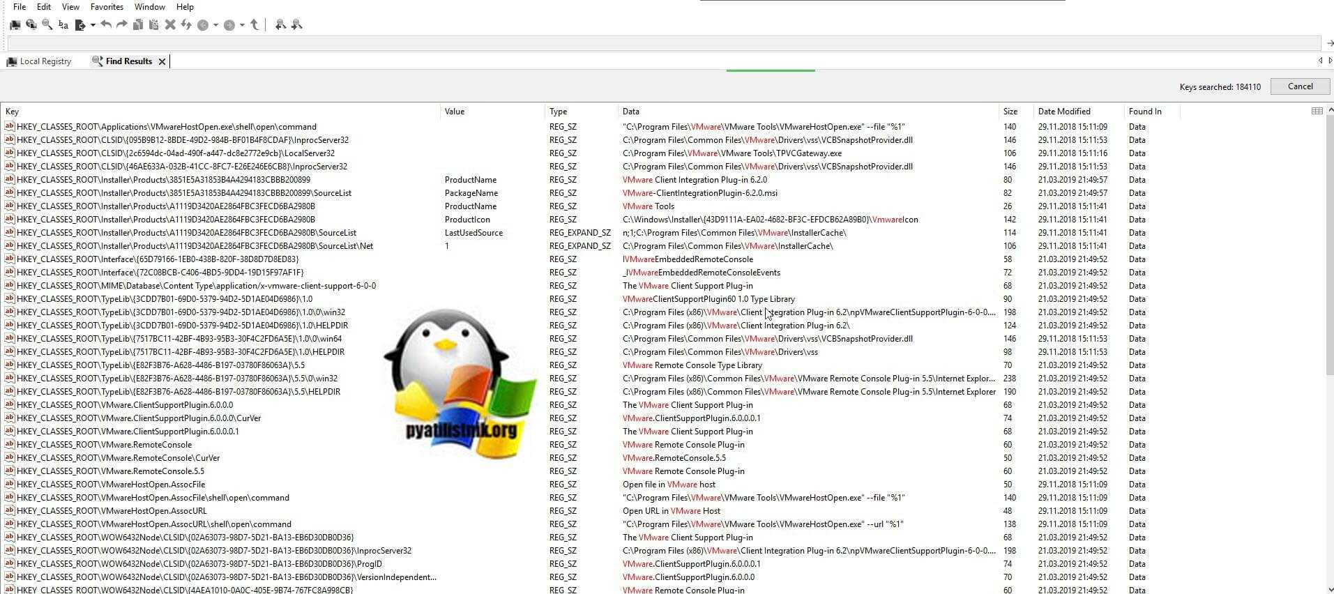 На выходе я получил подробную таблицу со всеми искомыми значениями. Красным подсвечивается точное вхождение. Данная утилита меня выручала много раз, когда мне нужно было искать значение в разных местах, например, когда у меня был черный экран Windows 10.