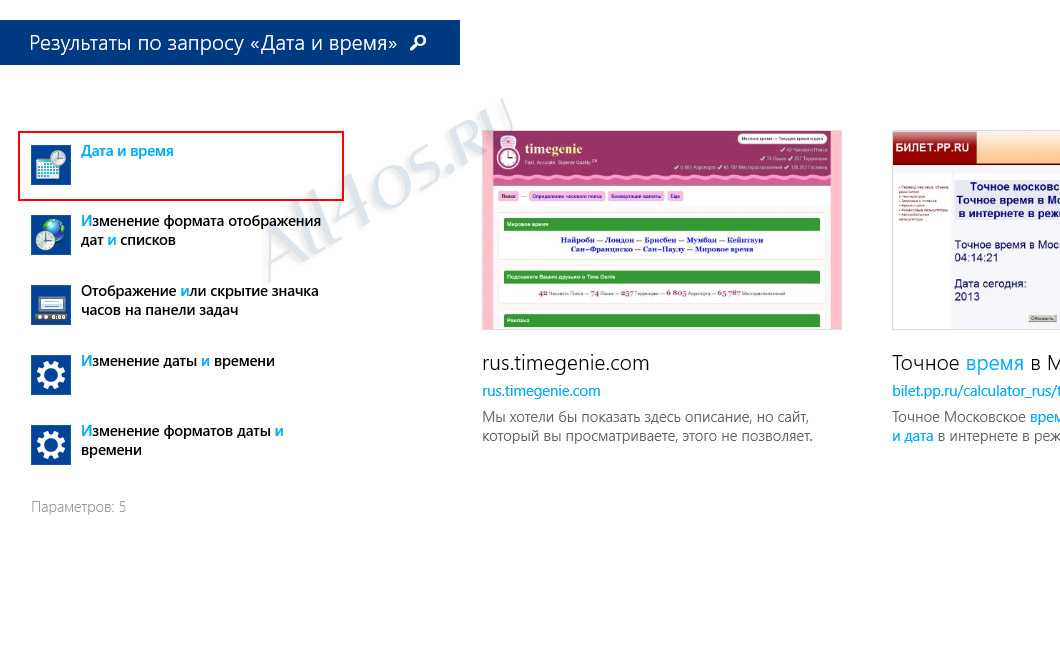 Есть и другие методы. Можно попробовать проверить точность времени в системе, так сказать сверить часы с серверами Microsoft. Для этого вызываем боковую панель кнопками Win+C переходим в поиск и набираем запрос «Дата и время»: