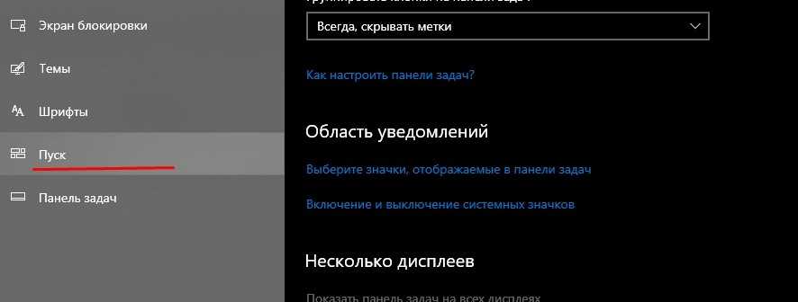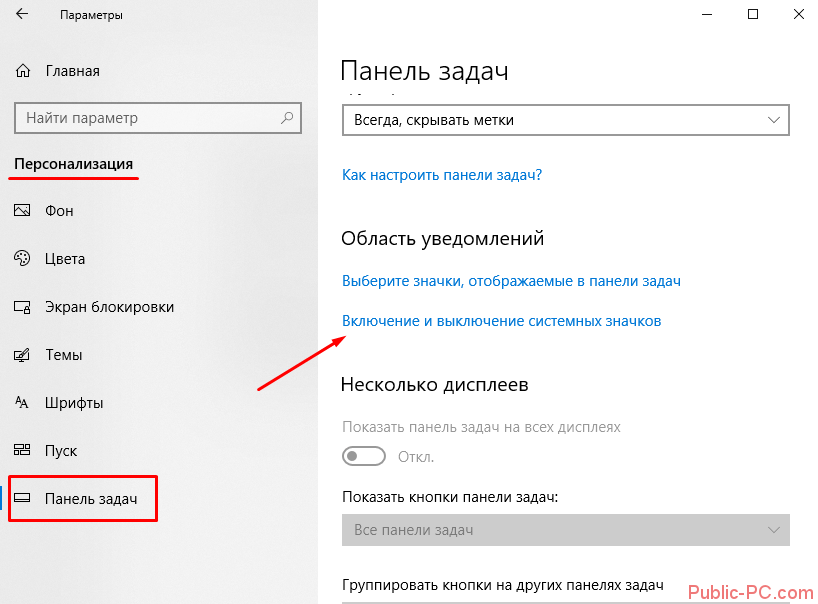 В результате перед вами должно появиться меню «Параметры» с открытым разделом «Персонализация – Панель задач». Здесь нужно пролистать список настроек и найти блок «Область уведомлений». В этом блоке будут ссылки на два подраздела: «Выберите значки, отображаемые в панели задач» и «Включение и выключение системных значков».