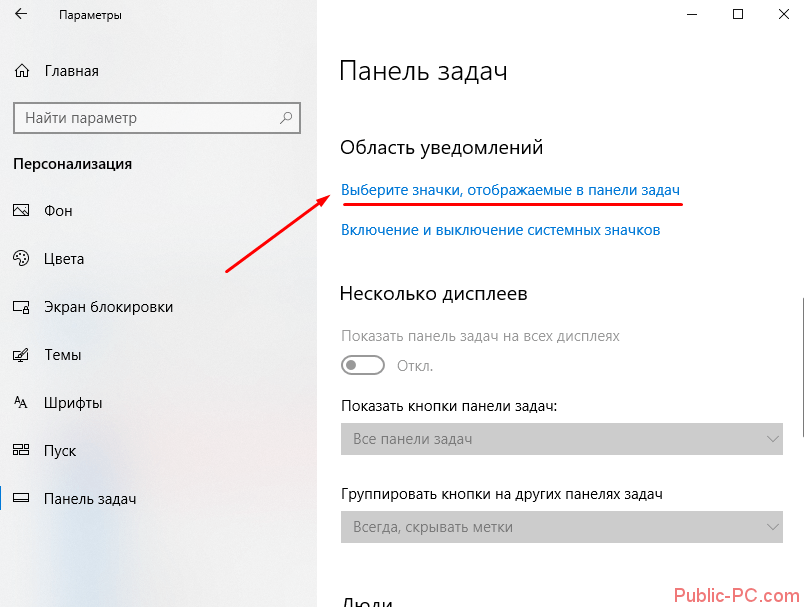 Возвращаемся в настройки панели задач и выбираем теперь первую ссылку «Выберите значки…».