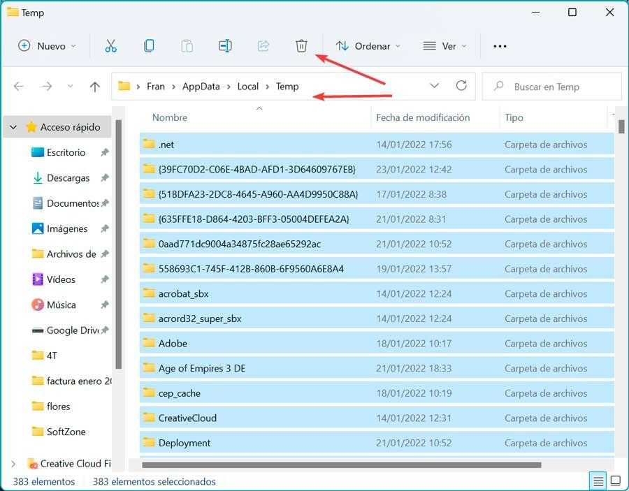Получив доступ к папке, мы должны удалить все содержащиеся в ней файлы и папки. Мы выделяем их все и нажимаем клавишу «DEL» на нашей клавиатуре. Наконец, мы перезагружаем компьютер, чтобы проверить, заработало ли оно.