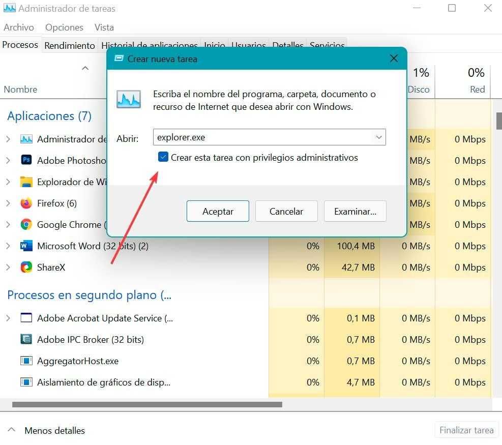 Затем мы нажимаем на вкладку «Файл», а затем на «Запустить новую задачу». Здесь мы набираем explorer.exe и ставим галочку «Создать эту задачу с правами администратора». Наконец, мы нажимаем «ОК».