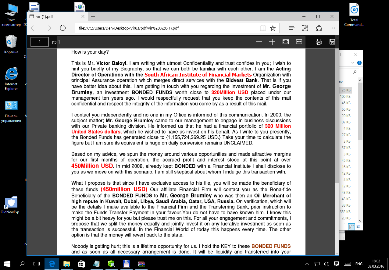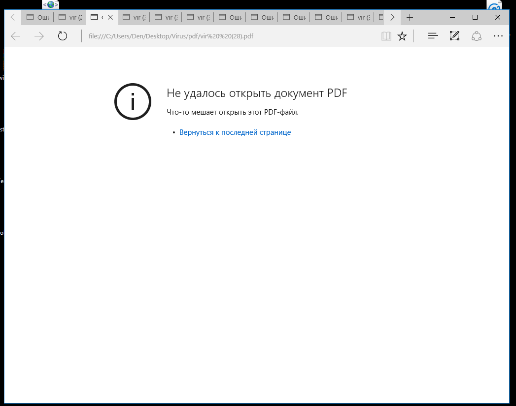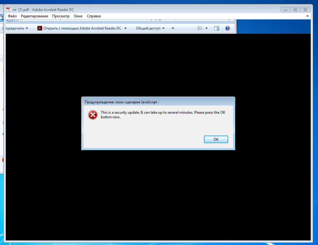 На скрине выше я открыл один из инфицированных PDF-документов в Win 7. Честно говоря, не ожидал такого эффекта. Стоит отметить, что после этого вируса Windows загрузилась со второй попытки. Поскольку при повторном открытии этого документа система больше не зависала, можно списать этот случай на глюки винды — то есть ее нормальное поведение. В Win 10 этот же файл открылся без происшествий.
