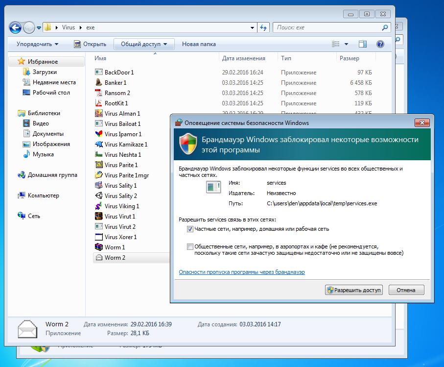 Даже если штатный антивирус отключен или не работает как нужно (в Win 7), на страже порядка в Windows стоят два средства — UAC и брандмауэр. Давай посмотрим, как брандмауэр блокировал запуск вируса ipamor, а UAC защищает систему от Ransom 2.