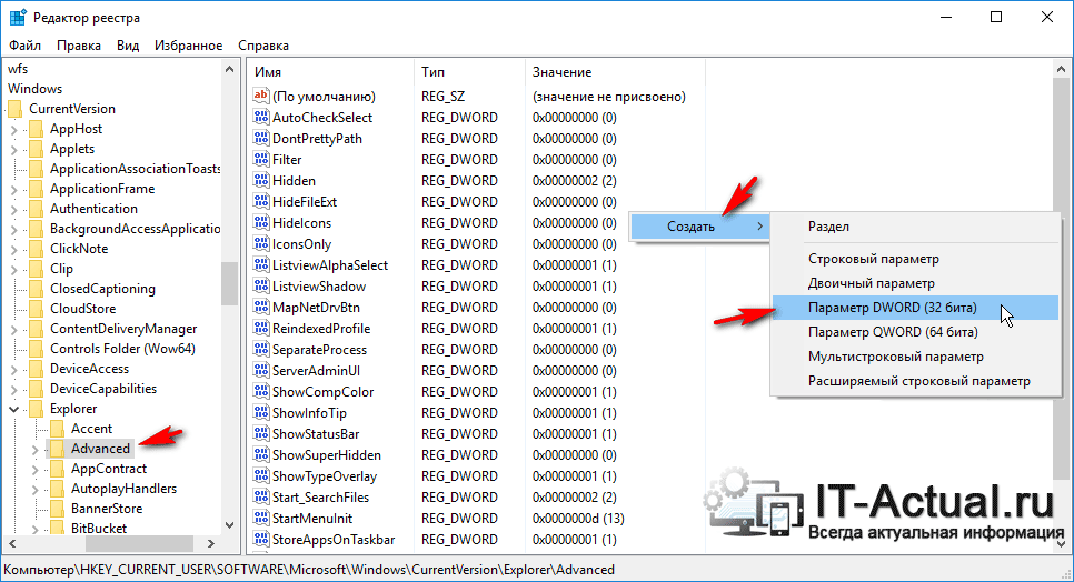 - Зайдите в раздел HKEY_CURRENT_USER\ Software\ Microsoft\ Windows\ CurrentVersion\ Explorer\ Advanced