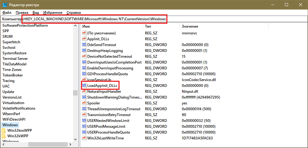и найдите параметр LoadAppInit_DLLs. Его значение должно быть установлено 0.