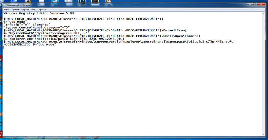 Windows Registry Editor Version 5.00 @="Режим бога" "InfoTip"="Все элементы" "System.ControlPanel.Category"="5" @="%SystemRoot%\System32\imageres.dll,-27" @="explorer.exe shell:::{ED7BA470-8E54-465E-825C-99712043E01C}" @="Режим бога" -