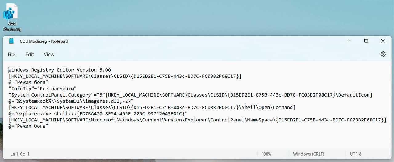 Неизвестно, задумывался ли раньше «режим бога» как один из элементов панели управления, но его можно туда добавить в виде значка, применив минимальное количество усилий. Проще всего сделать это путем создания соответствующего файла формата REG и его запуска. Он внесет изменения в реестр, и значок отобразится в панели управления. Используйте данный метод в том случае, если вариант с папкой вас не устраивает.