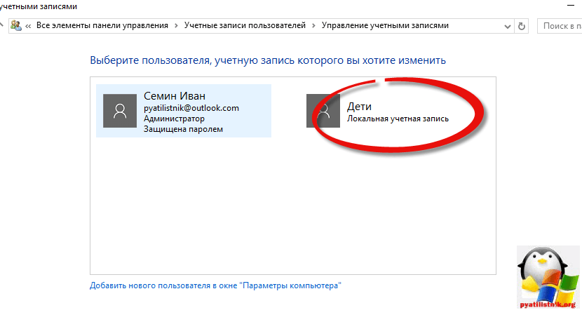 У меня есть учетная запись Дети, и у нее полные права администратора. Если же у вас нет другой учетной записи, то в этом же пункте вы можете его создать.