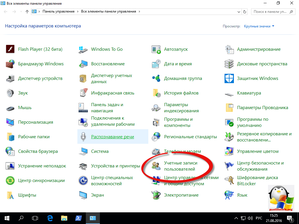 Что нам нужно, во первых если у вашего ребенка локальная учетная запись обладает права администратора, то сделать ее нужно обычным пользователем. Для этого открываем панель управления.