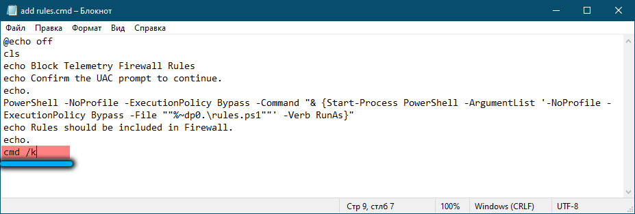 Есть и другой способ, хотя и он потребует от вас некоторых нетривиальных действий, а конкретнее – правки этого батника. Делается это посредством запуска любого текстового редактора (например, Блокнота). От вас потребуется в конце файла добавить строку и ввести команду pause.