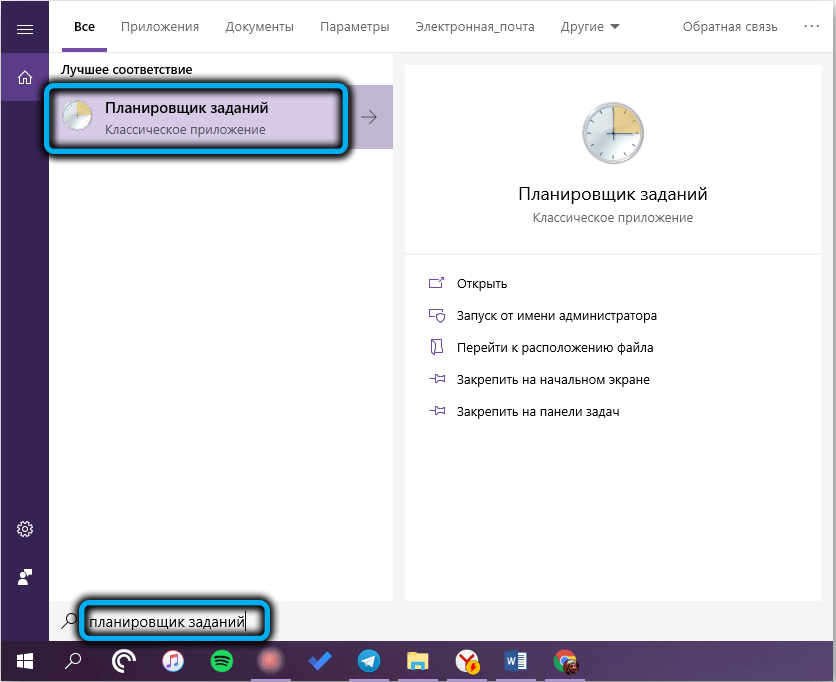 - Введите планировщик заданий в поле поиска и откройте программу.