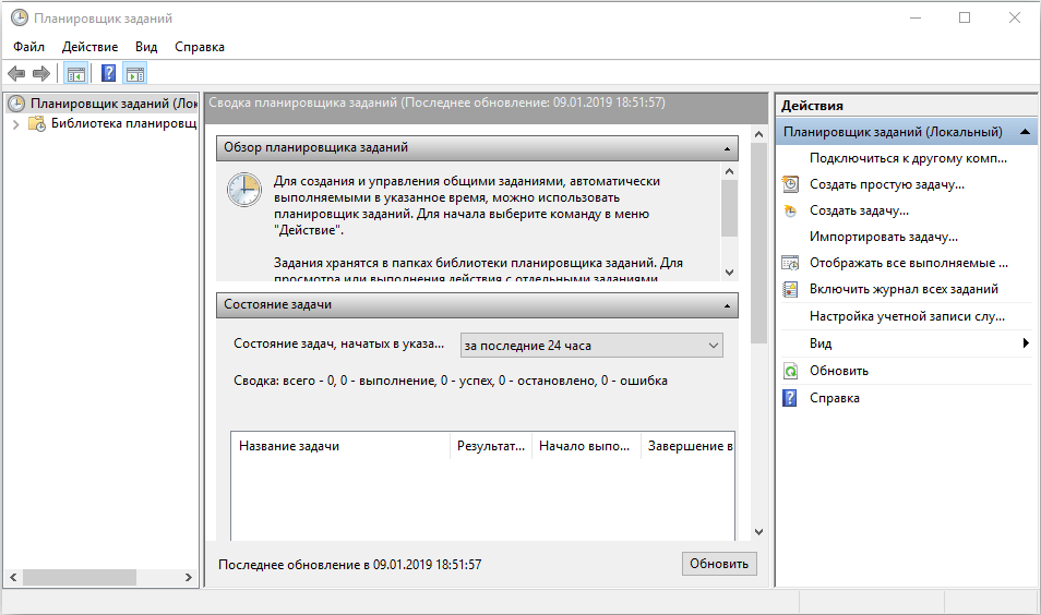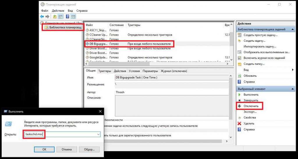 Чтобы получить более полную картину, следует вызвать «Планировщик задач» (taskschd.msc в меню «Выполнить»), а затем полностью отключить сомнительные процессы, находящиеся во включенном состоянии в разделе библиотек