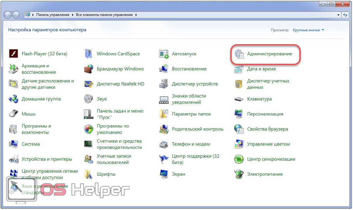 Открываем её любым путём и переходим в раздел «Администрирование».