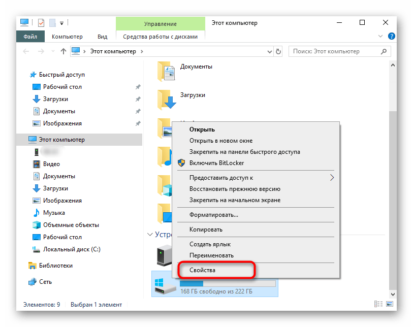 - Для этого откройте «Этот компьютер» и нажмите по системному разделу жесткого диска ПКМ. В контекстном меню выберите вариант «Свойства».