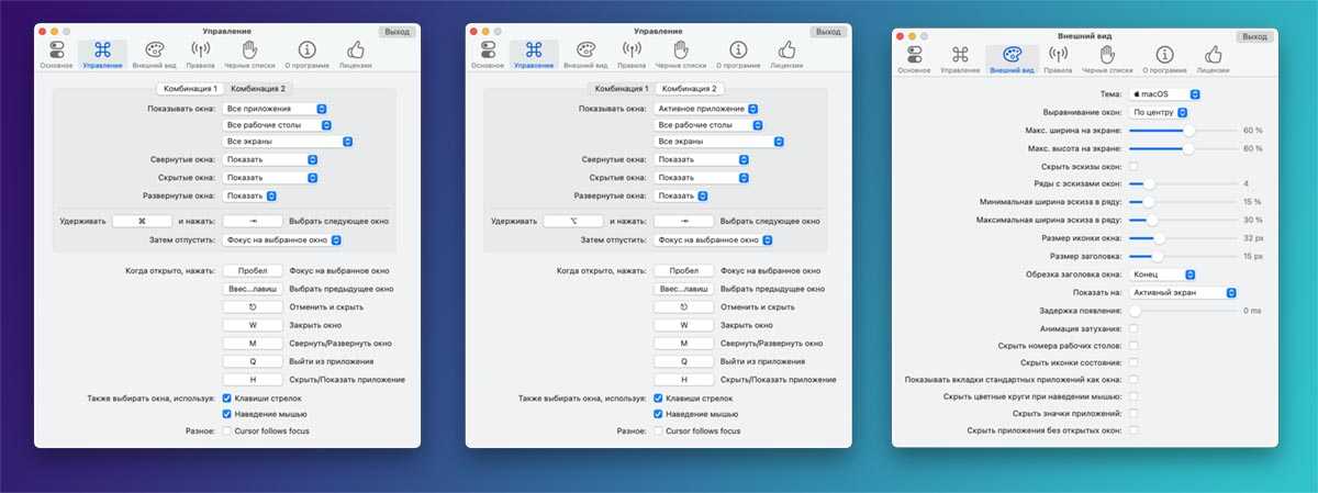 Параметры AltTab позволяют менять внешний вид меню, задавать специфические правила работы и исключения для определенных приложений.