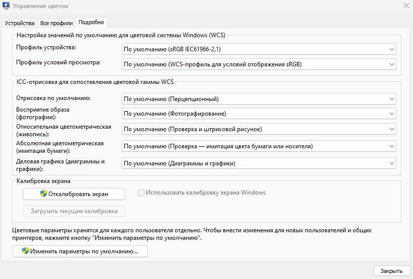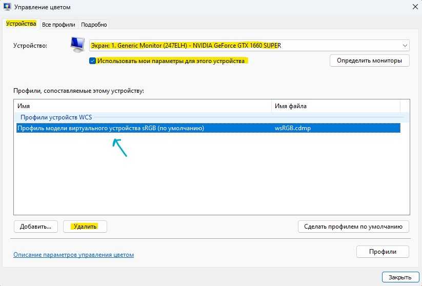 2. В пункте Устройства выберите свой монитор и установите галочку Использовать мои параметры для этого устройства. Далее ниже появится виртуальный профиль sRGB, выделите его и ниже нажмите Удалить.