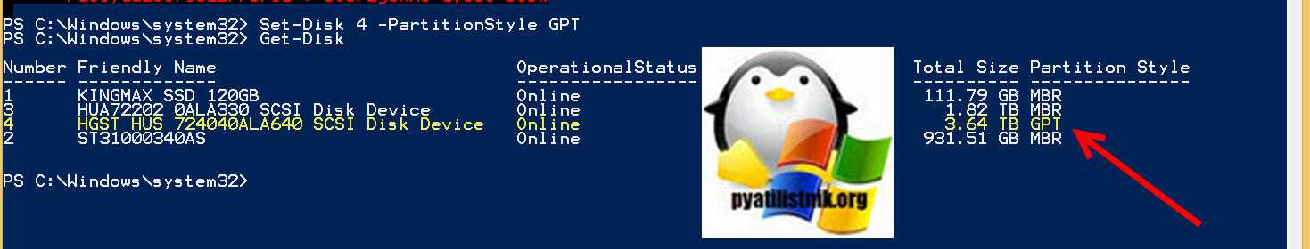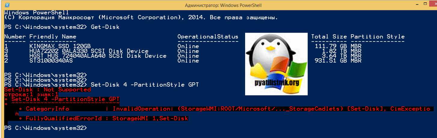 Set-Disk : Not Supported строка:1 знак:1 + Set-Disk 4 -PartitionStyle GPT + ~~~~~~~~~~~~~~~~~~~~~~~~~~~~~~ + CategoryInfo : InvalidOperation: (StorageWMI:ROOT/Microsoft/…_StorageCmdlets) , CimExceptio n + FullyQualifiedErrorId : StorageWMI 1,Set-Disk
