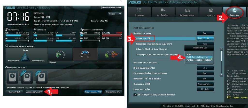 Для расширенной настройки биос, попав в него, первым делом нужно войти в раздел «Дополнительно». Найти его можно в нижней левой части открытого окошка UEFI BIOS, хотя достаточно и простого нажатия F7 на клавиатуре. Далее необходимо открыть меню «Загрузка», выбрать в нем вкладку «Поддержка USB» и установить для этого параметра значение Full Initialization: