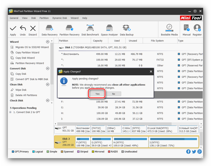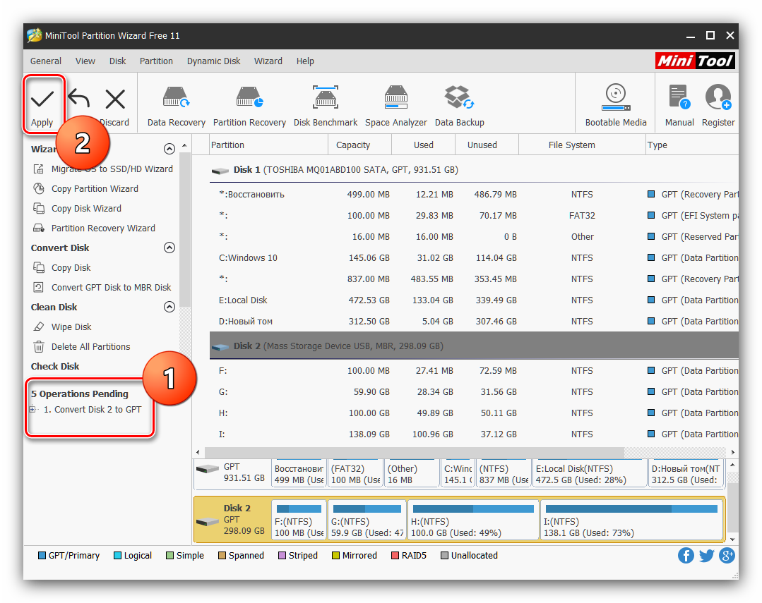 Убедитесь, что в блоке «Operation Pending» есть запись «Convert Disk to GPT», после чего нажимайте на кнопку «Apply» в панели инструментов.