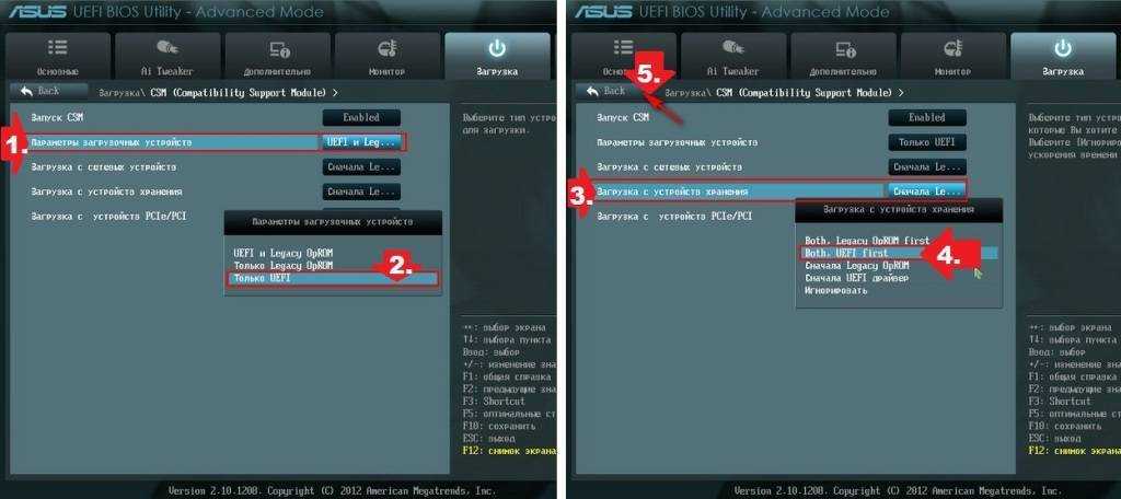 - выбрать в предложенном списке пункт «Загрузка с устройств хранения», прописать для него второй вариант из меню – Both, UEFI first;