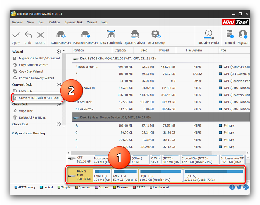 В видео ниже наглядно показано, как преобразовывать GPT диск в MBR при помощи программы Minitool Partition Wizard.