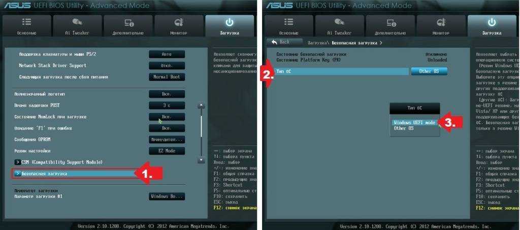 Теперь в меню «Загрузка» нам нужно установить значение Windows UEFI mode для опции «Безопасная загрузка». Для этого входим в соответствующий раздел, жмем «Тип ОС» и выбираем необходимый параметр в представленном меню: