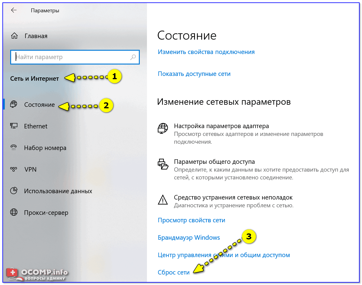 3) Если у вас ОС Windows 10 — сброс лучше выполнить из параметров системы (Win+i), через раздел ‘Сеть и Интернет / Состояние’.