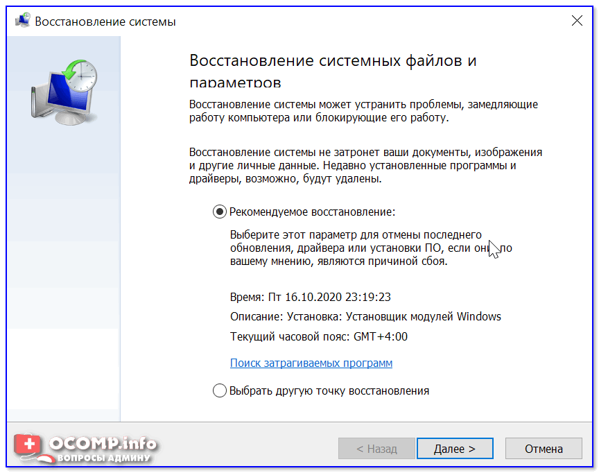 Как проверить, есть ли ‘точка’: нажать Win+R, ввести команду rstrui и нажать Enter. Далее Windows предложит откатить систему к той дате, когда 2затрагивались и изменялись’ системные файлы. В моем случае к 16.10.20… 👇,