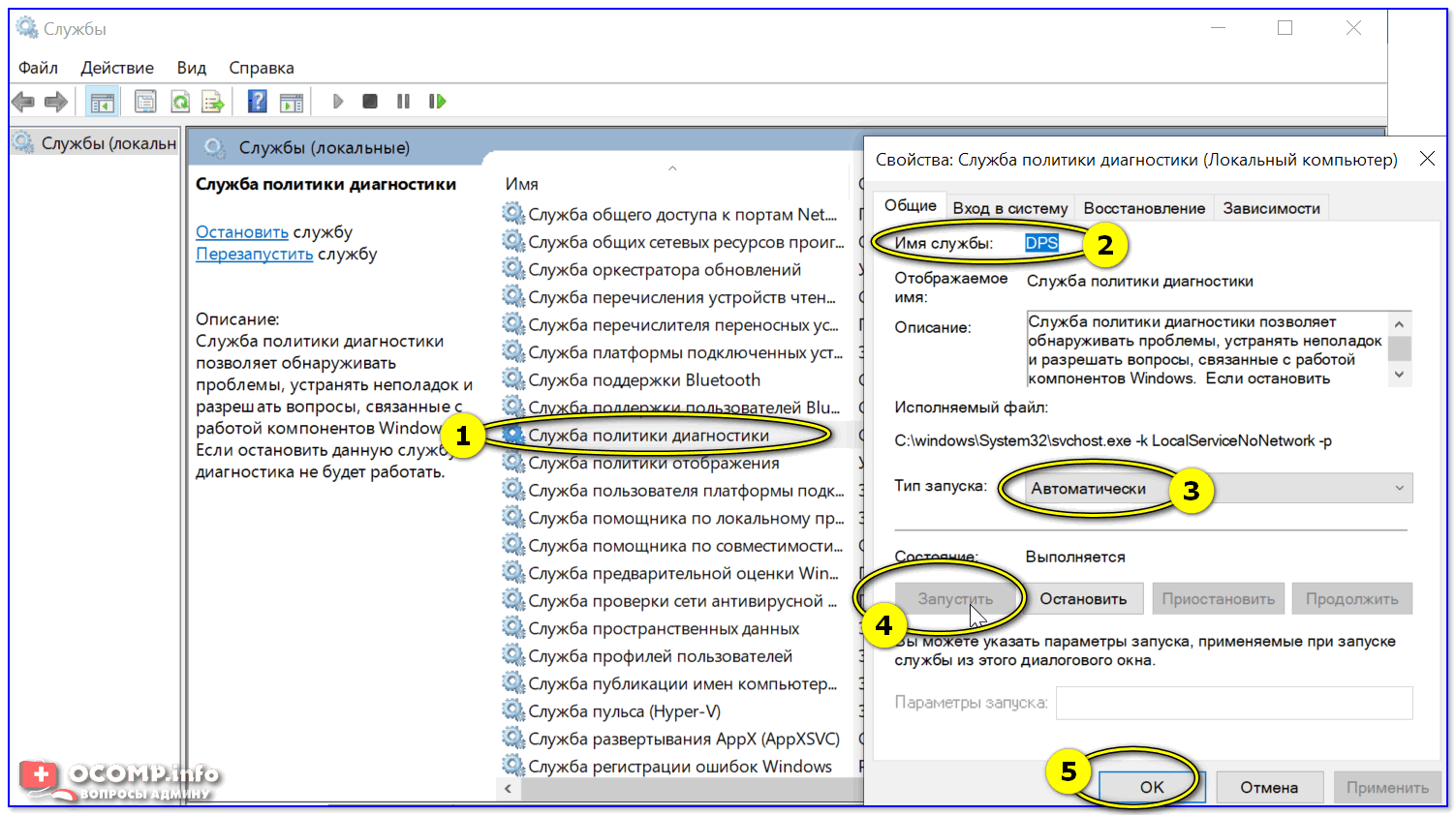 Далее в списке служб найдите ‘Служба политики диагностики’ и проверьте, чтобы она была включена!