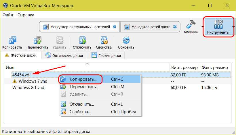 VirtualBox не позволяет своими средствами монтировать диски ВМ для доступа к ним из среды хост-системы Windows. Но в числе её арсенала есть конвертер, который может преобразовывать диски родного формата VDI в VHD, VMDK и прочие типы. А, к примеру, VHD-файл в среде хостовой Windows 8.1 или 10 можно открыть штатными средствами ОС. Более того, при необходимости продолжить работу с ВМ, её можно пересоздать на базе уже конвертированного диска VHD. В окне VirtualBox переключаемся на раздел «Инструменты». Кликаем диск нужной ВМ, в контекст-меню выбираем «Копировать».