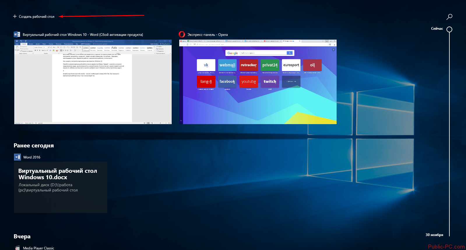 Для этой функции отдельной кнопки не предусмотрено – чтобы перейти к созданию и редактированию рабочих столов, нужно нажать на иконку «Представление задач» или Task View рядом с логотипом Microsoft и значком поиска. Нажатие на нее приводит к отображению на экране всех запущенных на данный момент приложений, а также открывает возможность создания новых виртуальных рабочих столов – просто нажмите на кнопку «Создать рабочий стол», что расположена в правом нижнем углу.