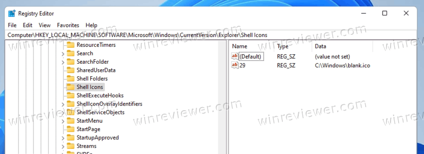 Наконец, в разделе HKEY_LOCAL_MACHINE\SOFTWARE\Microsoft\Windows\CurrentVersion\Explorer\Shell Icons вам нужно создать новое строковое значение (REG_SZ) и назвать его 29.