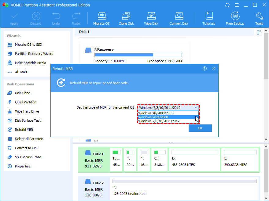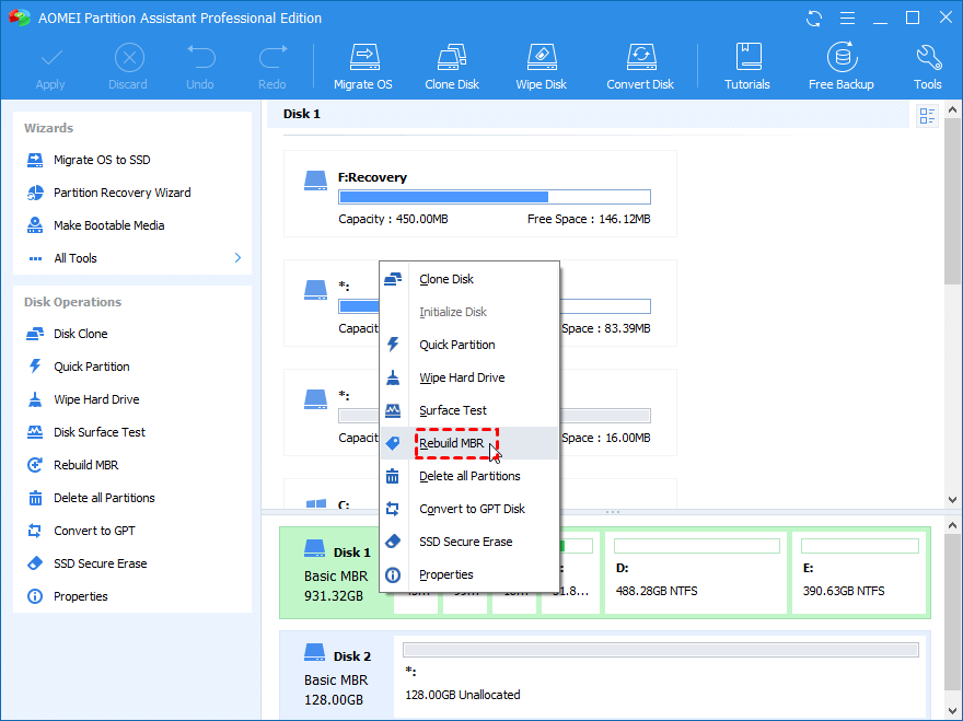 Using CMD is not easy for all users, especially when you need to type many pieces of complex commands. Therefore, a handy tool will be a convenient assistant to do it for you. AOMEI Partition Assistant Professional is a software to help users of Windows 11/8/7/XP/Vista to manage and protect their disks and partitions. The “Rebuild MBR” feature can avoid the risk of typing the wrong commands which might damage your disk.