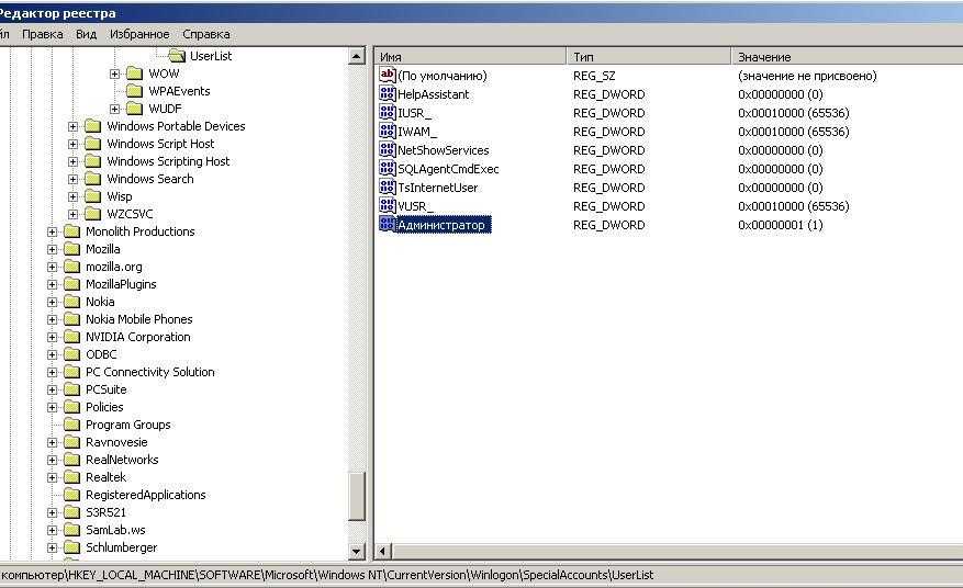 Отыскиваем раздел SpecialAccounts или создаем его, если не нашелся. В этом разделе ищем или создаем подраздел UserList, а в нем — новый параметр типа DWORD с именем скрываемой учетки. Если присвоить ему нулевое значение, то соответствующая учетная запись не будет отображаться ни на экране приветствия, ни в общем списке из панели управления.
