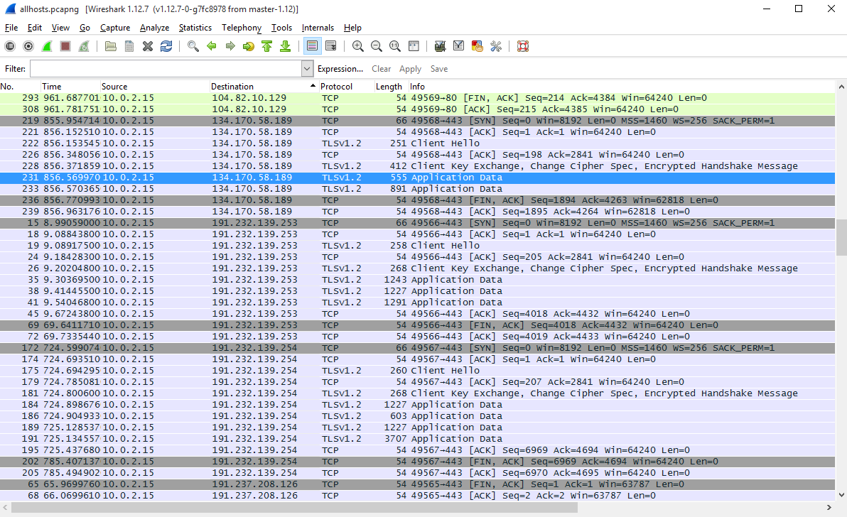 Раз уж Fiddler помог добыть список IP, то их массовое добавление в файл hosts должно помочь прекратить слежку. Проверим, создав список блокировки, и снова запустим Wireshark.