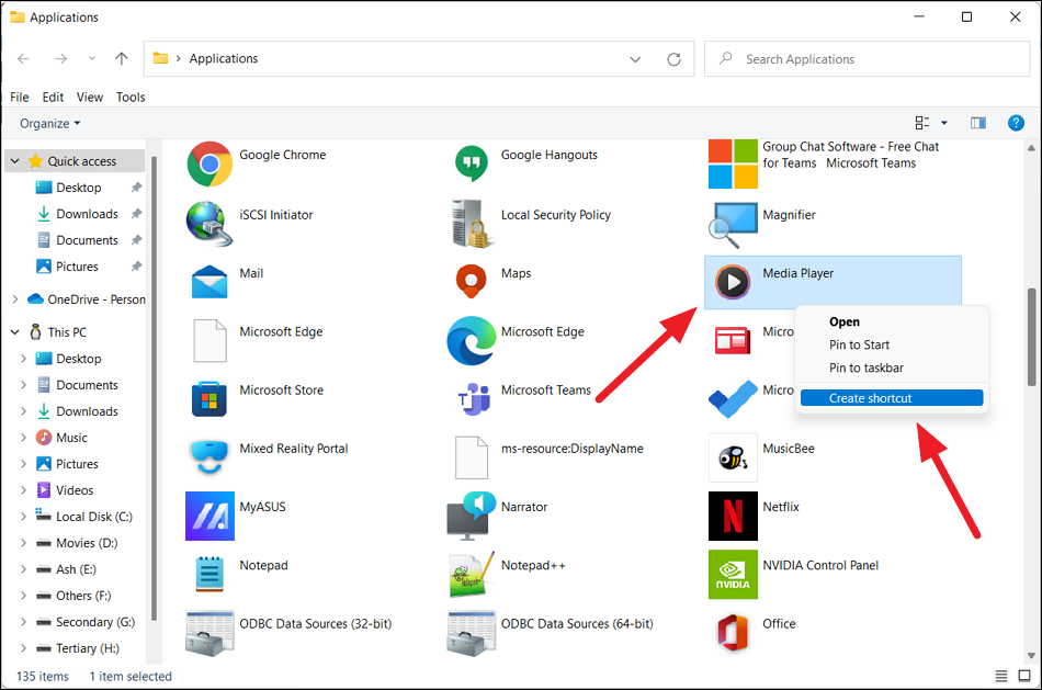 Откроется папка «Приложения», в которой вы можете найти все предварительно загруженные приложения Windows, приложения Магазина Windows и сторонние программы. Теперь найдите приложение, для которого вы хотите создать ярлык на рабочем столе. Затем щелкните правой кнопкой мыши приложение и выберите параметр «Создать ярлык».