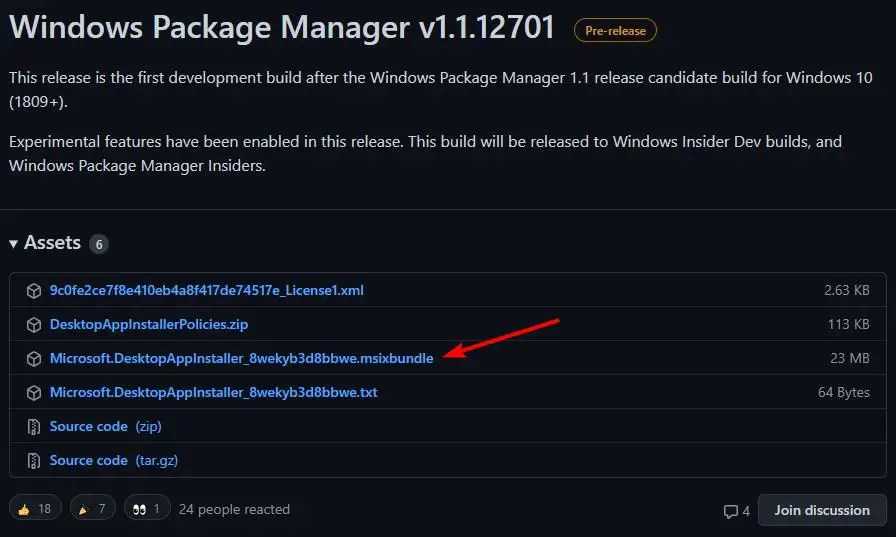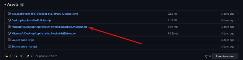 Когда откроется страница последней версии диспетчера пакетов Windows, щелкните ссылку для скачивания .msixbundle (Microsoft.DesktopAppInstaller_8wekyb3d8bbwe.msixbundle) в разделе Assets, чтобы загрузить автономный установщик.