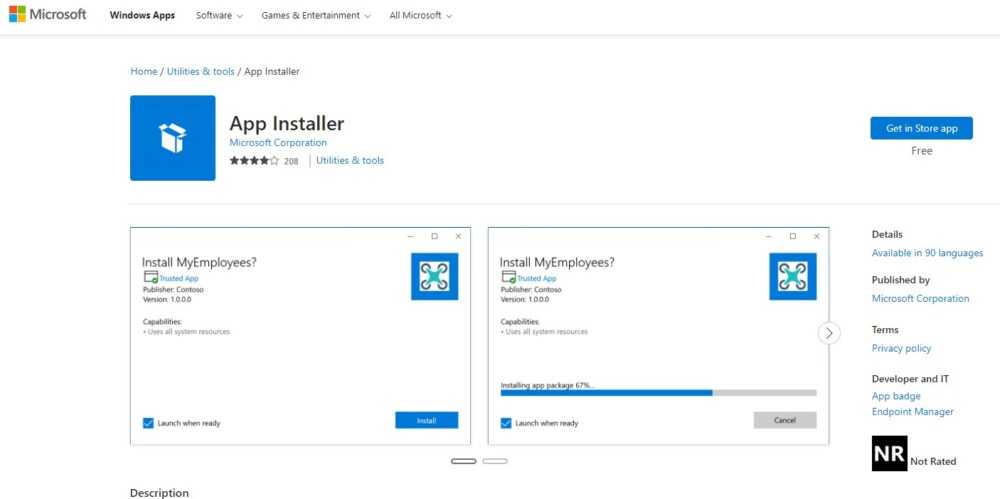Сначала перейдите на эту страницу и нажмите кнопку «Получить». При появлении запроса нажмите кнопку «Открыть Microsoft Store». Это действие откроет страницу установщика приложений в приложении Microsoft Store. Кроме того, вы можете выполнить поиск «Установщик приложений» непосредственно в магазине.