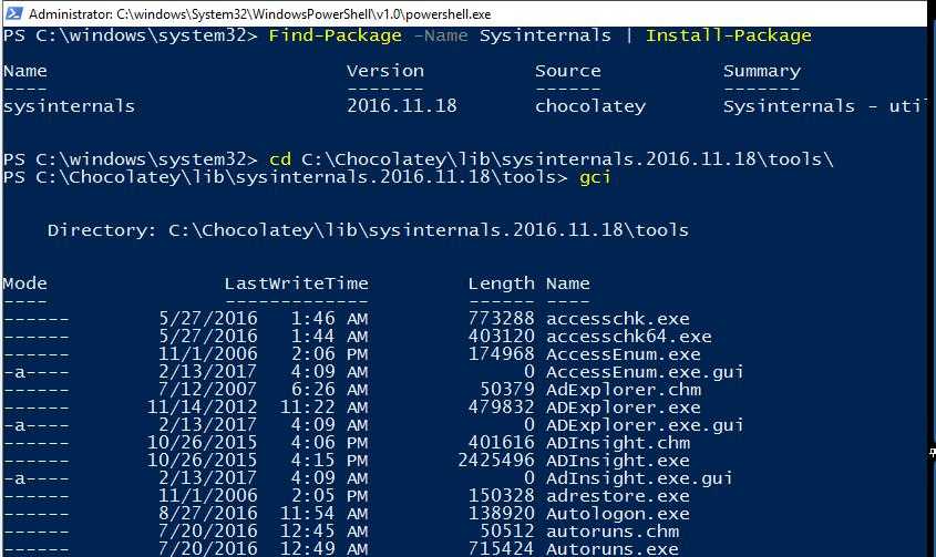 Т.к. пакет не требует установки, он сохраняется на компьютер и хранится в каталоге C:Chocolateylib. В нашем примере это каталог C:Chocolateylibsysinternals.2016.11.18tools