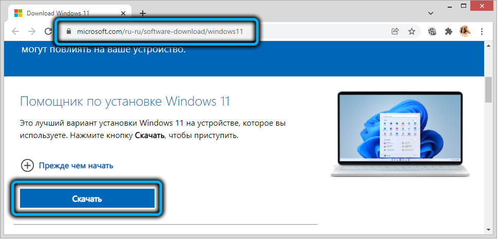 Второй способ можно назвать полуофициальным, поскольку при его применении можно использовать специальную утилиту «Помощник по установке Windows 11», размещенную на той же странице для скачивания новой ОС.