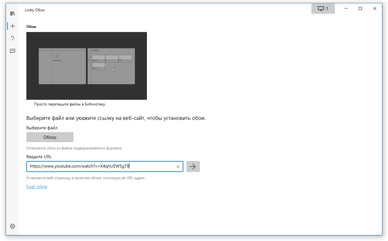 Чтоб установить понравившиеся обои в качестве фона рабочего окна, в главном окне приложения два раза кликаем мышкой на нужных. Для добавления новых обоев, необходим нажать плюс в правой панели. После чего в открывшееся окно нужно перетащить видео, GIF анимацию или HTML страницу, хранящуюся на диски компьютера, которую вы хотите использовать в качестве обоев. Если хотите использовать видео из YouTube или веб-страницу то вводим ссылку в строку «Введи URL». После чего они появятся в библиотеке обоев.