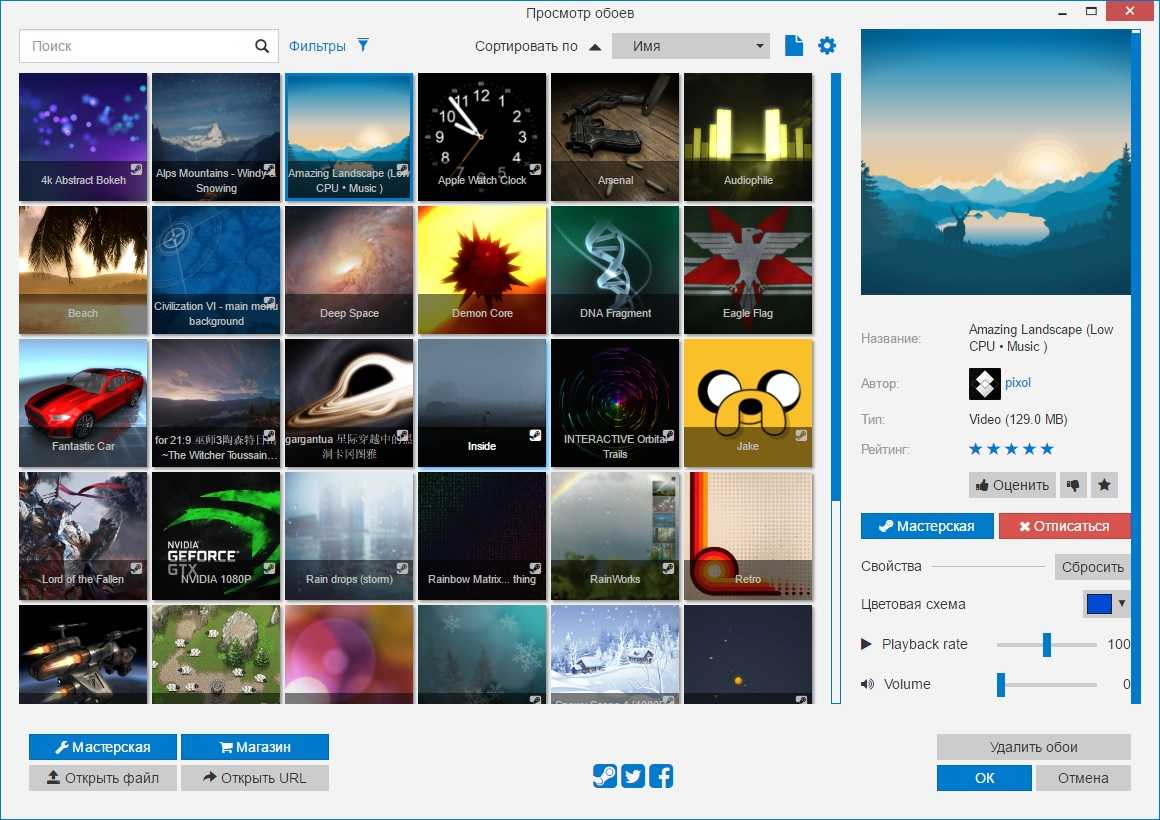 Для каждых обоев доступны собственные настройки, такие как скорость воспроизведения и другие, отображающиеся справа при выделении картинки. Вкладка «Мастерская» отвечает за скачивание новых анимаций. Купить премиум-варианты можно перейдя в магазин разработчика кликом по соответствующей кнопке.