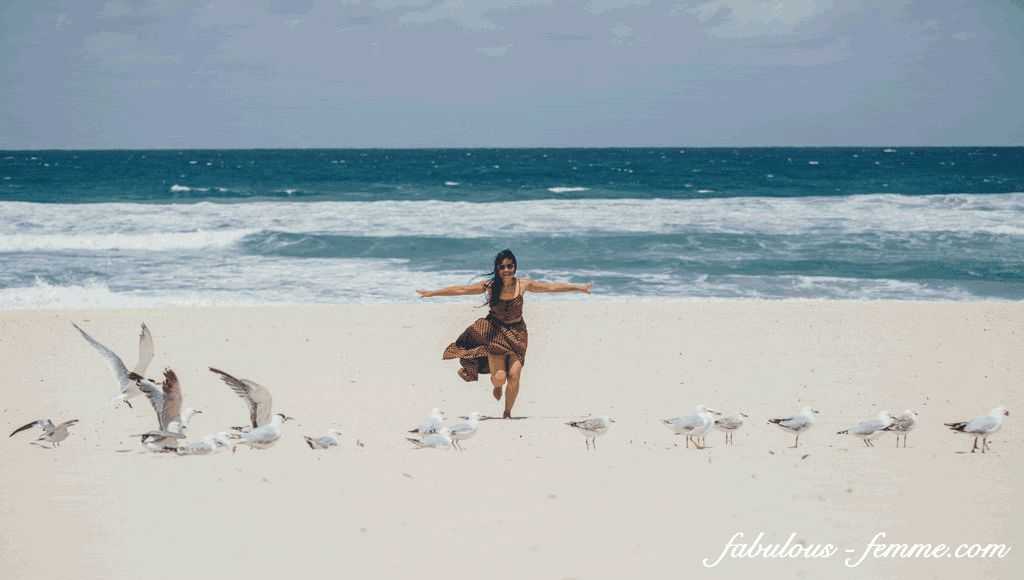 Девушка бежит по белоснежному тёплому песку босиком пугать чаек