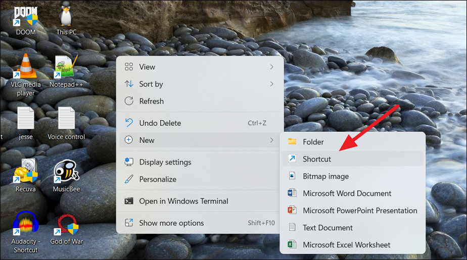 Кроме того, вы можете щелкнуть правой кнопкой мыши пустую область на рабочем столе, нажать «Создать» и выбрать «Ярлык».